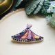 绣线、紫色、杏色葱线,搭配玻璃管珠、亮片、金属别针座、不织布、PU皮。