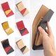 三种天然染色皮革:阿穆尔黄柏染色皮革(黄色)、苏木染色皮革(红色)和原木染色皮革(黑色)。