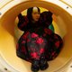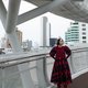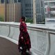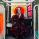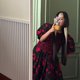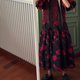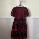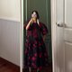 黑底红花缇花织纹洋装,拼接双层荷叶边与蓬松袖设计
