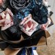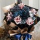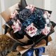 黑金搭雾蓝色系钞票花束,中型花束作品尺寸高度约35cm至45cm。花束内容以6朵大朵玫瑰钱花,雾蓝灰色系的厄瓜多尔尔不凋玫瑰花、不凋绣球花、不凋满天星、不凋雪松、索拉花等组合搭配。