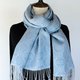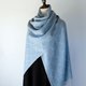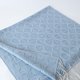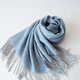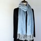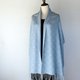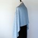 经线采用柔和的淡蓝,纬线采用柔和的蓝(勿忘我色),创造出精致复杂的图案。经线和纬线的色调差异很小,因此从远处看似很朴素,但在光线的反射下,光泽的图案清晰可见,打造出一条朴素而华丽的围巾。正面和背面的编织图案和颜色是相反的,因此您可以根据不同的穿着方式欣赏不同的外观。春秋季节可以铺开当作外衣使用,冬天可以像围巾一样围在脖子上。这款围巾呈现清新柔和的淡蓝,戴在脸上很好看,适合作为简约优雅的成人服装的点缀。