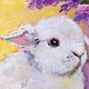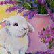The still life with lavender flowers and a white rabbit is painted with oil paints.