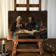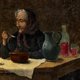 温馨的乡村风格老油画作品,描绘一对老夫妇共进简单餐食的场景,神情自然生动,充满生活气息与人情味,约制作于19世纪末至20世纪初,画面细节如陶壶、玻璃瓶与木桌等皆呈现出浓厚的欧洲乡村日常氛围,具有高度装饰与艺术价值。这幅画的画布边角有些微翘起,画面表层的张力也略显松弛,这些都是随着时间自然产生的痕迹,是这件作品独有的气质与历史感。