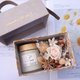 香槟色礼盒花材:永生玫瑰.索拉花.永生绣球.金色满天星.缎带.白星辰.松虫果
