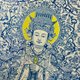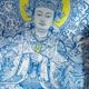灵感源自葡萄牙蓝瓷,天空的蓝,云朵的白,阳光的黄尽收在磁砖画里。妈祖手握印有台湾的笏板(奏板),祈求台湾顺遂上达天厅。