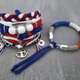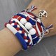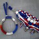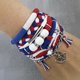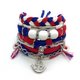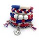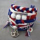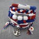 Nautical jewelry bohemian bracelet set of multi strand bracelet and crochet bangle in red, white and blue. Made using jersey straps, porcelain beads, natural linen yarn, color cotton threads, seed beads, metal chain, silver tone tube, ends and clasp. Anchor charm pendant, coins with red crystals and little fiber fringes.
