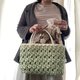 以清爽的绿色和白色为主调,这款手提袋由纸编绳制成。将柔和的绿色与香草白色纸编绳结合,编织出美丽的条纹图案。