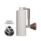 研磨刻度参考: 0-8格为保护刀盘,勿在此范围研磨 义式咖啡10-14格(NANO PLUS版本) 手冲咖啡18-24格 法式滤压壶25-27格 品名:泰摩TIMEMORE栗子NANO PLUS/NANO折叠便携式手摇磨豆机 材质:铝合金、不锈钢、胡桃木 容量:15g 产地:Made in P.R.C. 尺寸:机身10cm高,直径4.5cm