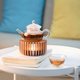 采用太空铝材质,氧化香槟金色给人时尚/自然的气息,点燃一只蜡烛,茶会一直保温。