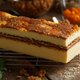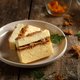- 充满怀旧情感的咸蛋糕,表层使用咸蛋黄加上不溶丁安佳干酪,上层是澎松戚风蛋糕,下层是绵密轻奶酪,中间夹馅料特别选用基隆百年名店美味香肉脯。咸蛋黄配奶酪以及两种不同蛋糕体,代表着两个世代融合在一起创造出新的记忆