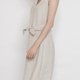 亚麻面料穿着透气舒适,V领修饰身型,腰间绑带勾勒腰身,杂点麻质朴自然,砖橘明亮温暖,搭配轻便的皮质凉鞋,显得轻松惬意。