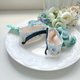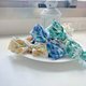 使用两款气质高雅的花朵/植物印花织带、折成自行发想的独特蝴蝶结,搭配素色织带并加上质感合金吊饰做装饰,看起来浪漫又立体显眼,走在路上不会到处撞款。