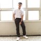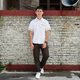 照片男模身高179;体重80,穿着S号长裤、M号上衣