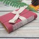 手工麂皮笔记本,勃艮第红,以白色棉蜡线缝制雏菊滚边,搭配浅粉色织带。内页选用柔和的道林纸,整本皆为手工缝制。