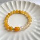 金枣是宜兰的代表,不仅可以制成蜜饯,金枣酱泡成的金枣茶更是对于喉咙有很大的帮助。蜜蜡枣珠天然的颜色和形状仿佛缩小版的金枣,搭配上金丝玉组成的渐层色,就像是黄澄澄的金枣茶