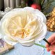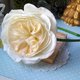新娘的头带上有一朵奶油色的英国玫瑰。带有茂盛英国玫瑰的头带将完美地补充新娘的喜庆形象,并使这个难忘的日子里的形象独一无二。