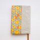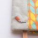 The front of this cover is made with an original design; a vibrant fabric reminiscent of a warm knitted sweater. The cover is mostly machine-sewn with a pencil motif hand-embroidered on the corner. A little peephole is worked into the front of the book cover to store a pen/pencil, making it fuss-free travel writing / drawing kit.