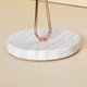 每一块风洞石,因表面有许多天然孔洞而闻名,所以主张不填补坑洞,呈现最原始的纹理,又以米黄色调的洞石居多,让人感到温和,而且还有一种强烈的文化和历史韵味,致常被用于世界各地建筑物外墙,于是我们采用了黄色洞石,把它缩小到可以置放在家里的厨房、客厅、书房亦或卧室的桌上,随时随地都可欣赏,再搭配玫瑰金色温柔的线条,不论放置何处,都别有一番低调的奢华感。