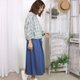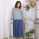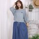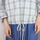 两件式洋装,外层格纹上衣,配色清新,下摆抽绳收腰设计,内层搭配牛仔色吊带裙,裙摆飘逸,穿着舒适。