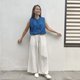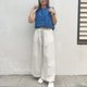 宽腿裤版型优雅大方,前褶设计,侧边隐形拉链,后腰松紧设计,穿着舒适贴合身形。配有两侧口袋,实用又时尚。米色纯棉面料,经水洗柔软,透气舒适,适合通勤或日常休闲穿搭。