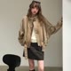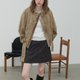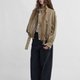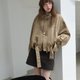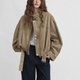 下摆叠褶设计,穿插有腰带设计,呈现自然堆叠的层次美感,门襟不规则挡风片开拉链设计,领口领袢,整体细节感十足,斜插袋便于使用,金属四合扣点缀,复古又有风格。