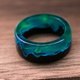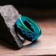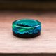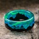 木质树脂戒指“Polar Night V2” - 戒指侧壁呈直线形状。 戒指由黑色鹅耳枥木和珠宝商的蓝色环氧树脂制成,带有绿色线条。