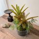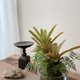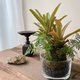 - 积水凤梨搭配兔脚蕨制作成混合版的苔球 搭配浅圆玻璃容器以及黑胆石铺在底下 让整体呈现自然的氛围 就像是走入森林取了一个景回来 摆在居家环境都能够疗愈心灵