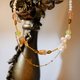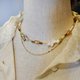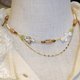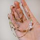 由多个细小的配件组成丰富的配搭,以香槟金沙粉色郁金香琉璃珠做主调,充满浪漫,配搭不规则花瓣形状的淡水珍珠,每一粒都独一无二。青绿色的葡萄石与粉红色形成对比,加上金色的配件和琥珀色的琉璃珠作为点缀,刻意加上链条形成两层的效果,整体升华带点复古。