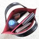 ◎ 采用厚实、坚挺的红色压纹皮革,压纹呈网格状,搭配黑色提把与车缝线,呈现都会风格的托特包(^^