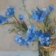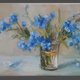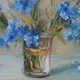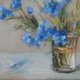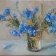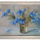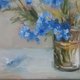 这幅油画捕捉了一束勿忘我的精致之美。这些花朵呈现柔和、鲜艳的蓝色色调,放在一个简单的玻璃花瓶中,让它们的自然魅力成为焦点。艺术家的笔触松散而富有印象派风格,传达出一种运动感和新鲜感。