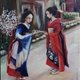 樱花盛开时的日本春城场景。两个穿着传统和服的亚洲女孩在樱花盛开的街道上相遇时分享了一个秘密。这幅画色彩鲜艳、温暖,女孩们的表情营造出一种俏皮的氛围,邀请您一起散步。