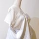 这件作品结合了两种不同质感的布料,一是带点乳白的棉麻,看得到粗细经纬线的交织,另一则是触感凉凉滑滑的混纺,细密的纹理和棉麻的质感形成有趣的对比。让整件乳白的作品在展现优雅气质的同时,还带点活泼俏皮的设计感。