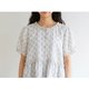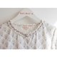 领口及衣身皆有荷叶边装饰,环绕整个衣身,背面亦可见荷叶边设计。娃娃袖设计,开襟式上衣,钮扣可实际使用。白色碎花上衣,花朵成束,搭配蓝色蝴蝶结。