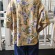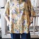 翻领衬衫,棉麻印花,短袖,无袖笼,侧边高开衩,弧形下摆。