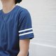 基本素色T款,袖口上印上两条撞色条纹,领口V形补强位,衫尾亦加入撞色车线等细节打造这件质感作品。