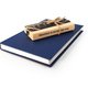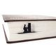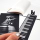 书页之间的钢琴键。书的侧面有弹钢琴的女士的剪影。