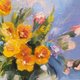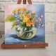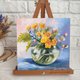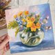 这幅瓶中花卉的油画,采用裱有画布的硬纸板创作,尺寸为 20/20 厘米。此花卉画作采用“一次性绘画法”(alla prima) 技法,立体的笔触让画作显得生动且现代。这幅明亮的原创花卉静物画将为您的居家空间增添色彩,亦可成为赠送亲友的难忘礼物。