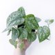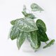 星点藤,也叫银斑葛、银星绿萝,Spindapsus pictus ’Argyraeus’,是天南星科绿萝属,它有着叶肉质状的圆心型或长圆心形叶子,叶端突尖,叶面绒绿,布满不规则银绿色斑块或斑点,叶色清逸美观,垂坠的姿态,乍看以为是常见的黄金葛,仔细一看叶片上多了不规则的银白斑点,会随着光照的多寡而改变,生长节点容易长出气根,埋进土壤里即可繁殖生长,养护简单,还是非常适合室内的小盆栽呢!室内散光、明亮处都适合,如果想帮窗台换点样式,他是个好选择唷!