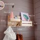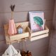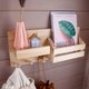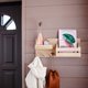 Wooden wall organizer with shelf with peg hooks for clothes, bags, or hats. Ideal for entryway, hallway or any other room. Has a slot for books, letters or magazines.