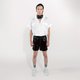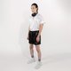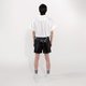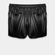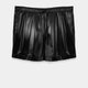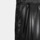 表面以亮面仿皮机能弹性面料制成,里有网布衬里。双侧边塑钢拉链,腰围以松紧带与绑带做结合,让原本运动元素更添时尚感。