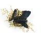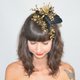 Handmade sinamay round base in black with cascading delicate gold leaves and black butterfly. The base is 9cm diameter and the overall piece is approximately 14cm high.