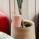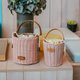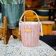 粉色藤条在市场上非常罕见,因为它需要多次重复多次染色而成。由于粉红色很受少女喜爱, 特别编一个迷你版小藤篮, 仍保存手拿或斜肩结构, 再配搭田园印花里布及索口布, 非常可爱, 俗语所谓麻雀虽小, 五脏俱合来形容它, 十分恰当。