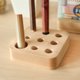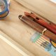 若您仔细观看笔架上细心凿开的九个孔洞,就会发现孔洞的大小共有3种不同的类型。孔洞的深度皆为1.6cm。最大的孔洞直径为2cm,能够放置印鉴;隔壁的孔洞直径分别为1.2cm与0.8cm,能让您依照笔的粗细来选用适合的大小。不论任何粗细的笔或是印鉴都能够站立的笔架,从细部的精巧设计与制工之中能感受到制作者的用心,也让这款收纳架充满着一般量产品无法比拟的魅力,也可说是难得的梦幻逸品。.