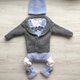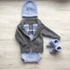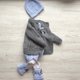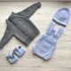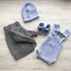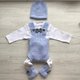Knit clothing set for baby boy. Sweater, romper, hat and booties. Can be as take home or baptism outfit for newborn boy. A wonderfull shower gift for the expecting parents makes a really cute New Mom or New Dad gift.