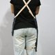 _ 四合扣环调整交叉革带牛仔围裙,深蓝牛仔布洗染后带点陈旧感, 有前3个插袋设计、笔插袋、缺角概念、双面色双面布。男女都适合。