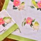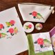 A watercolor painting of sasanqua and white-eye playing on the green rim to match the color of the white-eye's feathers. 5 patterns are arranged randomly.