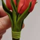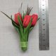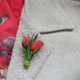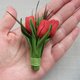 皮革胸针,缀以深珊瑚色郁金香与闪耀的孔雀羽毛。