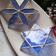 一组两件的彩绘玻璃雪花挂饰。适合圣诞树或窗户的装饰品。简约的居家彩绘玻璃装饰。蓝色梅尔卡巴玻璃星星。新年树上的手工玩具。圣诞树玩具。温馨的圣诞节送礼选择,适合赠予朋友。彩绘玻璃圣诞星星。