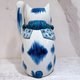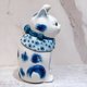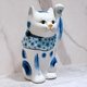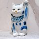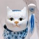 以白色瓷器为基调,采用蓝色染付技法绘制图案,猫咪举起左手象征招福