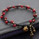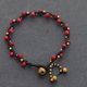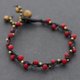 这是手工编织的手链,由黑色蜡线与圆形珊瑚珠和黄铜珠编织而成。